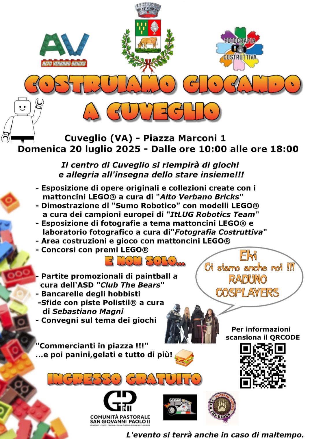 Il cuore di Cuveglio si trasforma per un’intera giornata in un grande parco giochi all’aperto! Domenica 20 luglio 2025, adulti e bambini potranno vivere un’esperienza unica tra costruzioni, sfide, cosplay e laboratori creativi in occasione di Costruiamo Giocando, un evento gratuito e ricchissimo di attività per tutte le età.