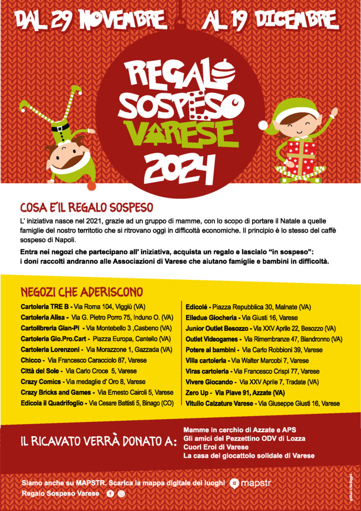 Entra nei negozi che partecipano all’iniziativa, acquista un regalo e lascialo “in sospeso”: i doni raccolti andranno alle Associazioni di Varese che aiutano famiglie e bambini in difficoltà.