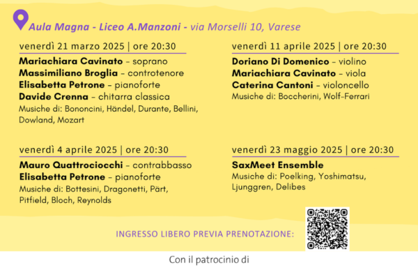 Il Liceo Musicale Statale “A. Manzoni” di Varese dà il via alla terza edizione delle “Serate Musicali”, una serie di concerti benefici che mettono in risalto la bravura dei docenti di strumento dell’istituto. L’iniziativa ha l’obiettivo di valorizzare il talento musicale, promuovere il Liceo come punto di riferimento artistico e avvicinare giovani e bambini al mondo della musica.